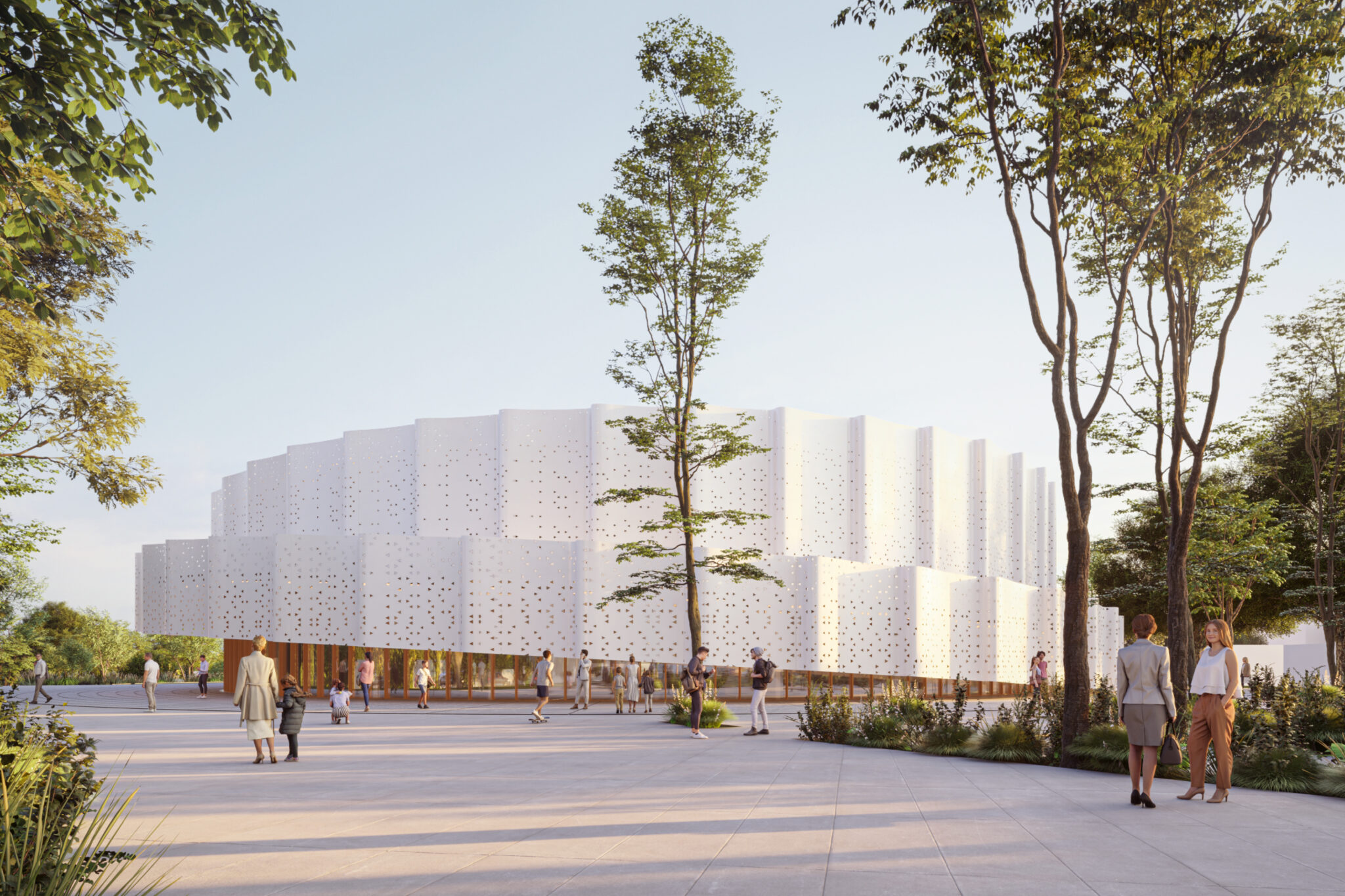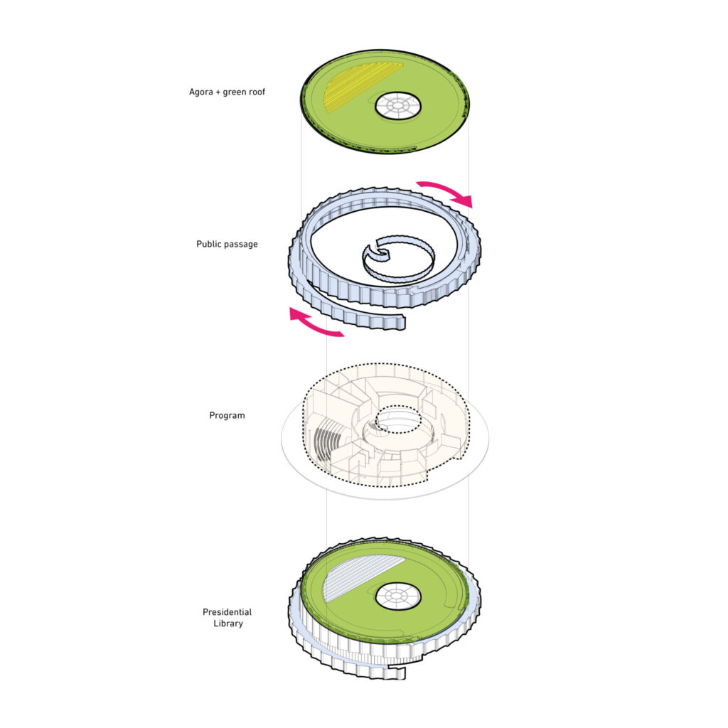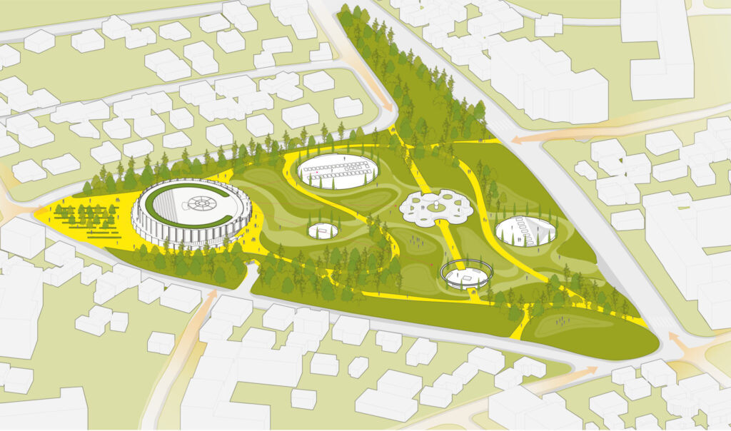 Die runde Gebäudefigur wird von einem spiralförmigen Element umschlungen, den weichen Falten eines Schals nachempfunden. Diese Bewegung strukturiert Zugang, Wegeführung und räumliche Erlebnisse. Außen wird der Schal zur ansteigenden Promenade, die Besucherinnen und Besucher vom Park aufs Gründach führt – ein öffentlicher Ort des Ausblicks, der Ruhe und der symbolischen Erhebung.