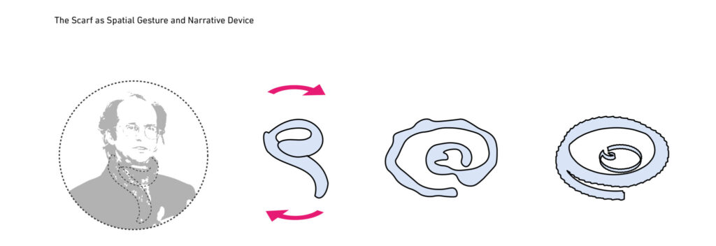 Zentrales konzeptionelles Motiv ist Rugovas ikonischer Schal – Symbol seiner kultivierten Haltung, intellektuellen Eleganz und stillen Resistenz. Im Projekt wird er zur räumlichen Strategie: ein Band, das Form, Bewegung und Erinnerung leitet.