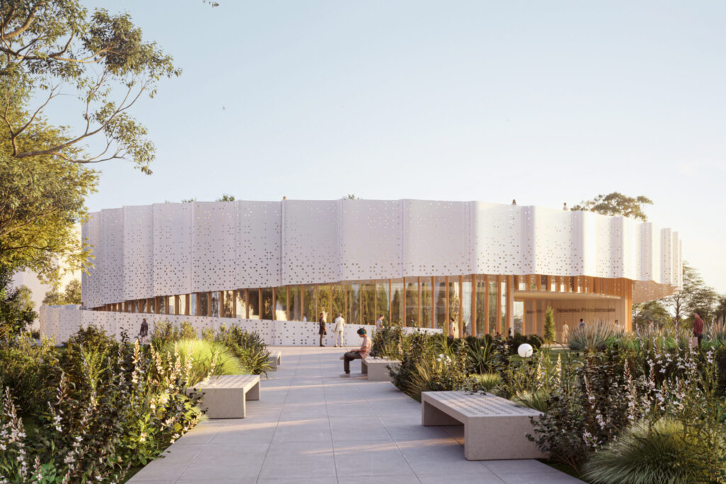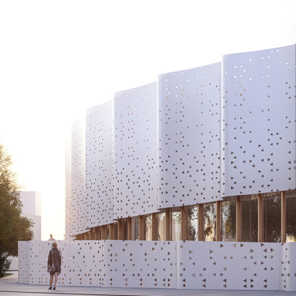 Im Inneren setzt sich diese Logik fort: Der Schal führt um ein lichtdurchflutetes Atrium, das als zeitgenössische Agora konzipiert ist. Eine große Lichtkuppel bringt natürliches Licht in das Zentrum und verbindet Wissen, Denken und Öffentlichkeit.