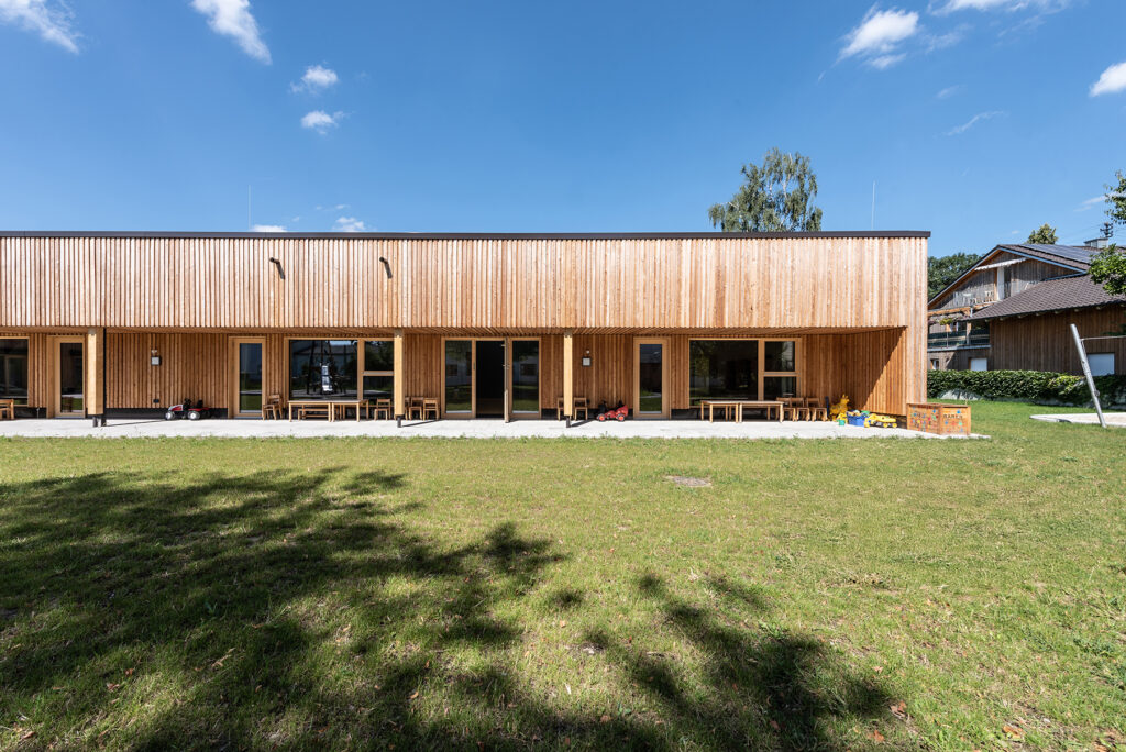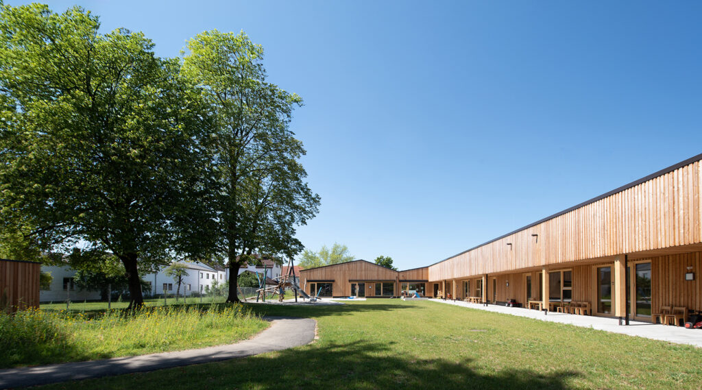 Platz für 100 Kinder, helle Gruppenräume und ein nachhaltiger Holzbau– so präsentiert sich der Neubau des Kindergartens Sankt Margareta in Ampfing. Der in Holzständerbauweise errichtete Kindergarten mit begrüntem Dach löst den in die Jahre gekommenen Bestandskindergarten Nuntius Pacelli (Baujahr 1974) ab. Das auf dem Grundstück befindliche und vom Kindergarten mitgenutzte „Schwesternwohnheim“ (Baujahr 1904) sowie ein Modulbau mit kleinem Verbindungsbau weichen ebenfalls dem Neubau. So erhalten die Kinder nicht nur einen neuen, aus überwiegend natürlichen und nachwachsenden Materialien erbauten Kindergarten, sondern im Vergleich zu den Vorgängerbauten auch einen Ort, der Orientierung leicht macht.