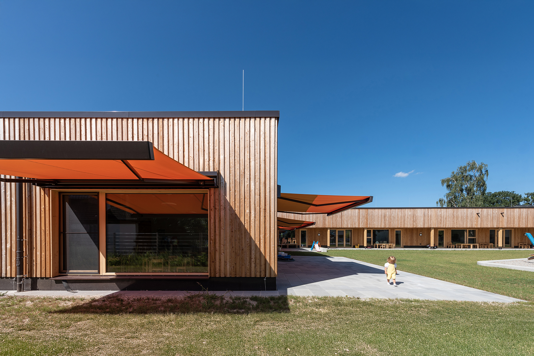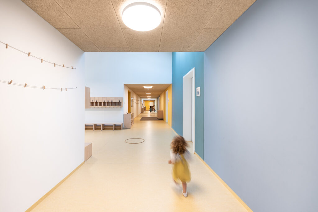 Kinder und Eltern kommen von einem überdachten Eingangsbereich in ein lichtes Foyer im mittleren Gebäudeteil. Eine große Glasfront öffnet Ankommenden den Blick in den dahinterliegenden Garten. Während sich die Gruppenbereiche mit Garderoben und weiteren zugehörigen Räumen sowie ein Multifunktionsraum des Kindergartens im nördlichen Gebäudeflügel befinden, sind Leitungs- und Personalräume, Speisesaal für rund 45 Kinder und Küche im südlichen Flügel angesiedelt. Die vier hellen Gruppenräume orientieren sich nach Süden und öffnen sich mit breiten Fensterfronten zum Garten. Eine Spielgalerie erweitert jede Gruppe und bietet den Kindern Raum zum Rückzug, eigenständigen Spielen oder für Gruppenangebote. Zusätzlich bereichern Spiel- und Musikzimmer sowie ein Atelier das pädagogische Angebot des Kindergartens.