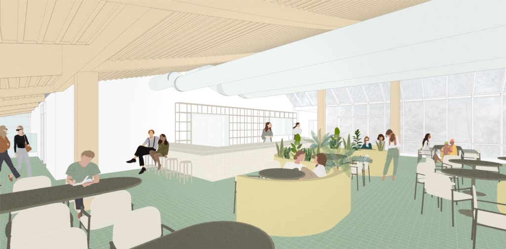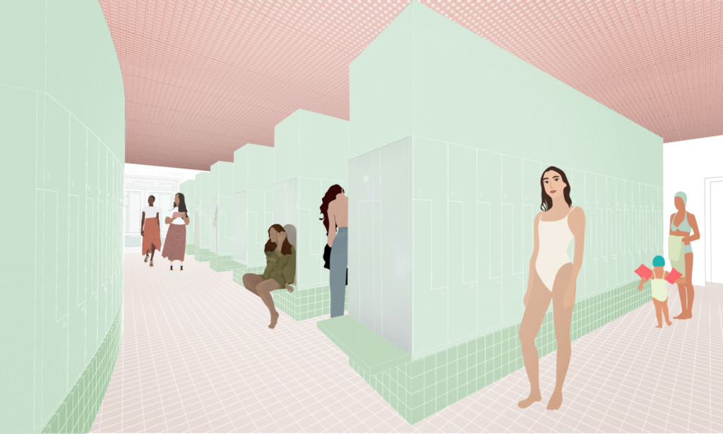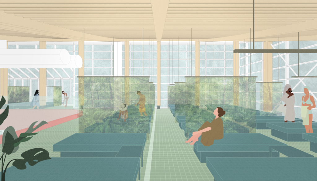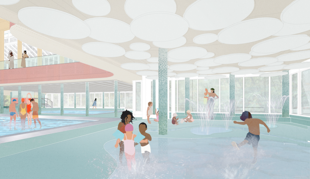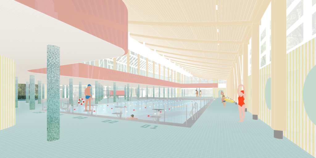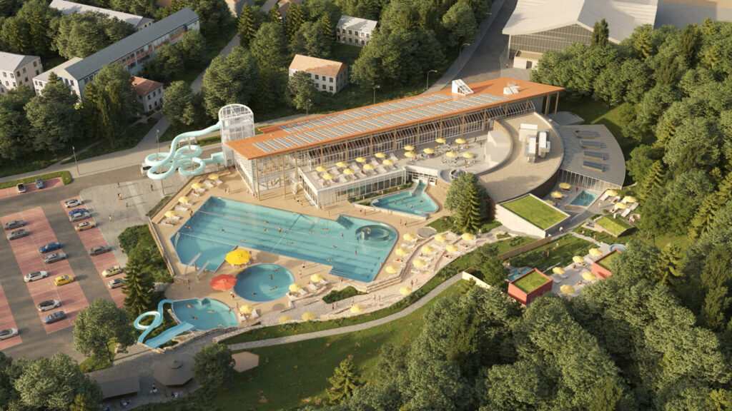 Parallel zur Neuorganisation der Wasserflächen wird die Besucherführung umfassend überarbeitet. Es entstehen ein neuer Eingangsbereich mit Kassenanlage, vollständig neu strukturierte Umkleiden mit Nebenräumen sowie neue Aufenthaltsbereiche und Flächen für die Badeaufsicht. Ein großzügiger Wintergarten mit Ruhe- und Liegezonen erweitert die Aufenthaltsqualität im Innenraum und wird durch eine direkt angeschlossene Sonnenterrasse ergänzt. Darüber hinaus wird der Gastronomiebereich Erlebnisbads vollständig neu gestaltet und durch zusätzliche Liege- und Aufenthaltsflächen auf einer Galerieebene erweitert. Als markantes architektonisches Element entsteht eine neue transparente Röhrenrutsche mit eigenständigem Rutschentreppenturm, die künftig als prägendes Wahrzeichen des Bades fungiert.