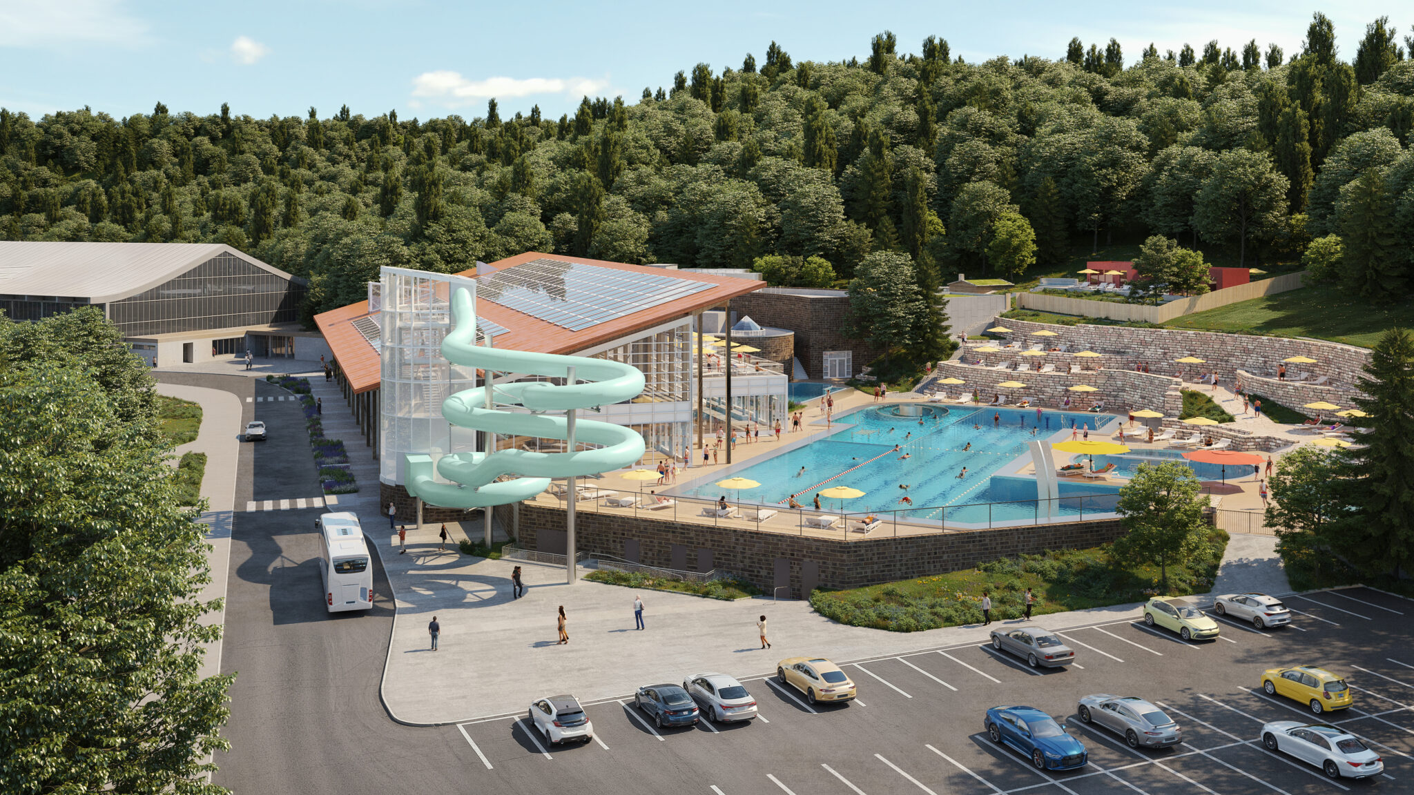 Parallel zur Neuorganisation der Wasserflächen wird die Besucherführung umfassend überarbeitet. Es entstehen ein neuer Eingangsbereich mit Kassenanlage, vollständig neu strukturierte Umkleiden mit Nebenräumen sowie neue Aufenthaltsbereiche und Flächen für die Badeaufsicht. Ein großzügiger Wintergarten mit Ruhe- und Liegezonen erweitert die Aufenthaltsqualität im Innenraum und wird durch eine direkt angeschlossene Sonnenterrasse ergänzt. Darüber hinaus wird der Gastronomiebereich Erlebnisbads vollständig neu gestaltet und durch zusätzliche Liege- und Aufenthaltsflächen auf einer Galerieebene erweitert. Als markantes architektonisches Element entsteht eine neue transparente Röhrenrutsche mit eigenständigem Rutschentreppenturm, die künftig als prägendes Wahrzeichen des Bades fungiert.