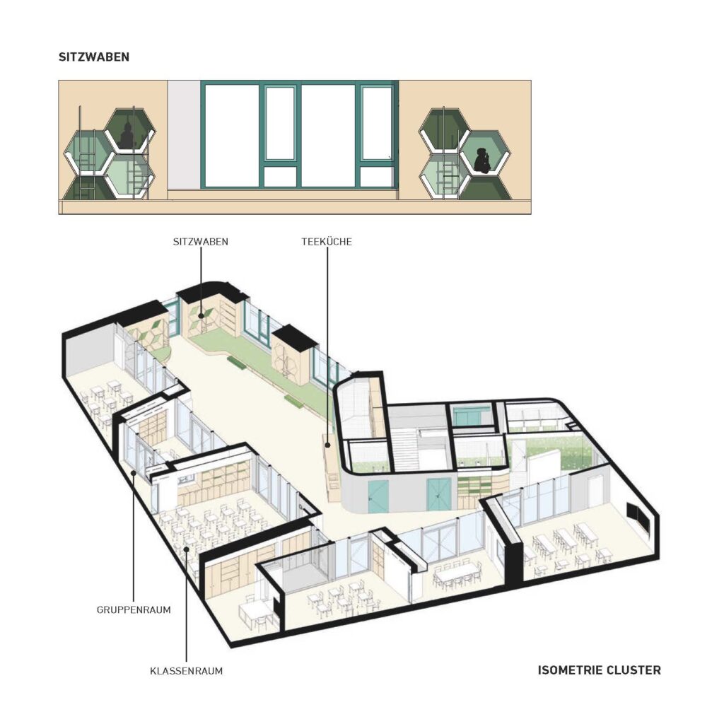 In den beiden Obergeschossen befinden sich jeweils zwei Lerncluster, die durch einen sogenannten Filterbereich getrennt sind – hier liegen die Spinde der Schülerinnen und Schüler. Jedes Cluster ist als pädagogische Einheit konzipiert und umfasst vier Klassenräume, zwei Gruppenräume, eine große gemeinsame Mitte mit Ruhe- und Spielzonen, ein Lehrerzimmer sowie Sanitär- und Technikräume. Alle Räume orientieren sich zur Fassade, wodurch sie von natürlichem Licht durchflutet werden und vielfältige Blickbeziehungen ins umliegende Grün ermöglichen.
