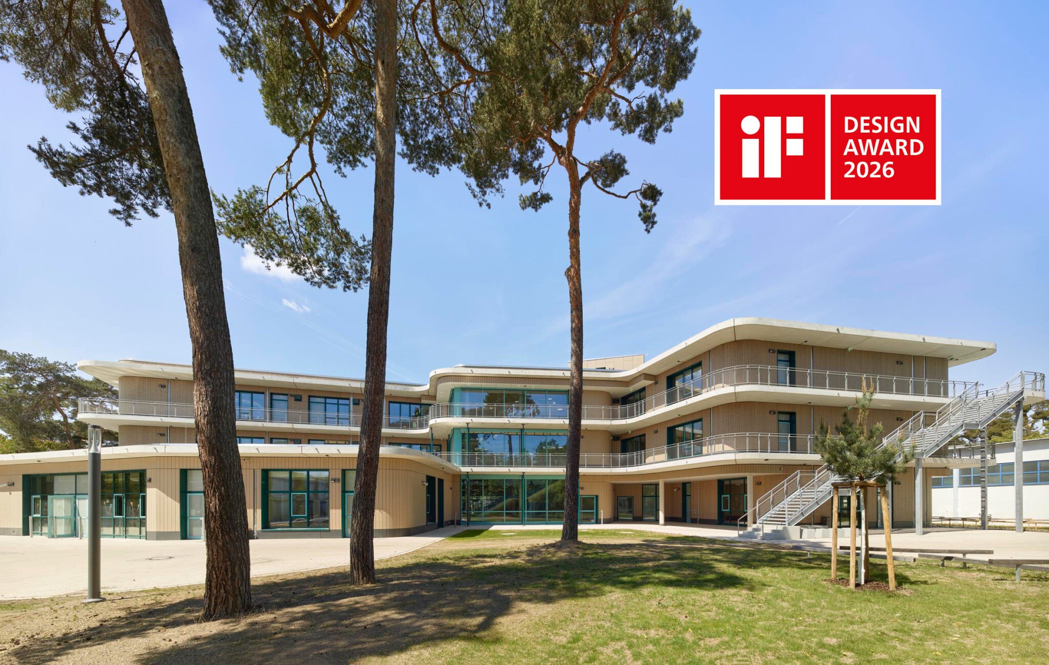 Die freundliche, naturnahe Gestaltung des Neubaus wird durch die helle Kiefernholzschalung der Fassade unterstützt. Die Oberfläche ist fein gehobelt, die Formensprache fließend und organisch. Großzügige Fensterflächen, in denen sich die Bäume spiegeln, öffnen den Blick auf das umliegende Grün, lassen Innen- und Außenraum miteinander in Dialog treten und holen die Natur ins Schulhaus. Die Gebäudehülle ist als vorgefertigte Holzelement-Fassade mit integrierten Fensterrahmen ausgeführt; die tragende Struktur bildet ein Stahlbetonskelett. Umlaufende Fluchtbalkone strukturieren die Fassade horizontal und erschließen die Obergeschosse auf kurzem Weg.